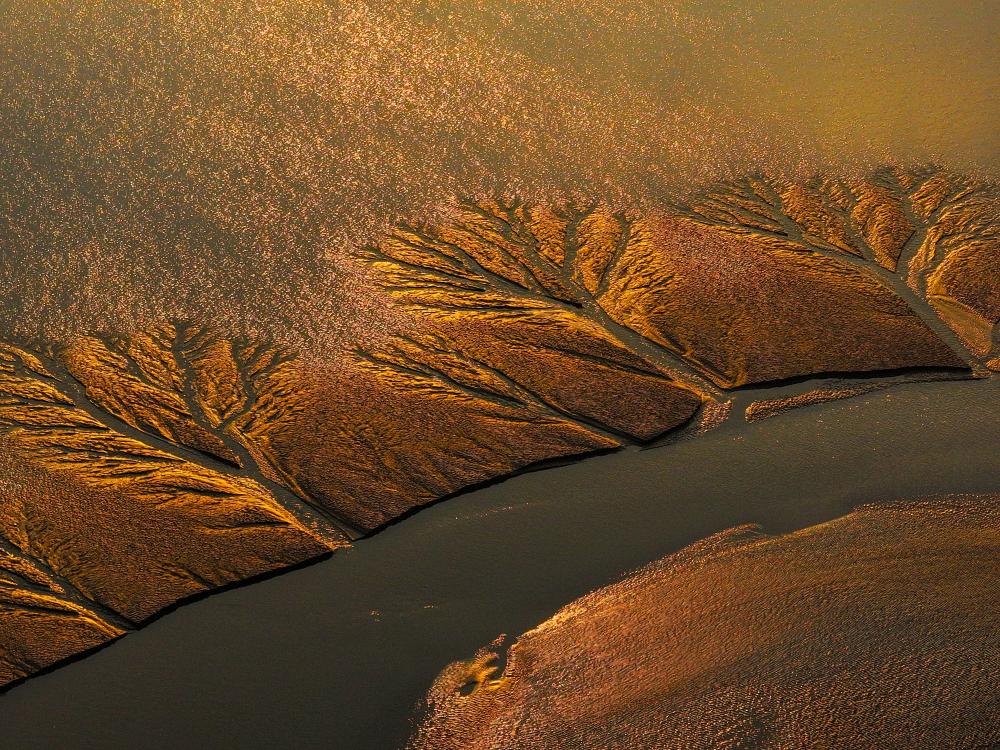 Huellas en forma de árbol forman una imagen magnífica en la llanura de marea de la ciudad de Yancheng
